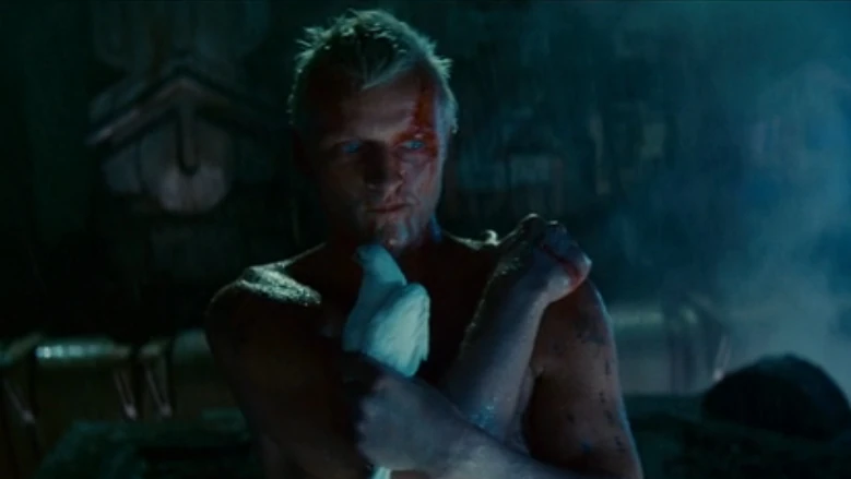 Deckard is sent to Sebastian's apartment after the murders and is ambushed by Pris, though he manages to shoot her after a struggle. Roy returns moments later, trapping Deckard in the apartment and playfully hunting him throughout the dilapidated Bradbury Apartments, eventually forcing him to the roof. Deckard attempts a jump to another building and ends up desperately hanging from a beam. Roy easily makes the jump and stares down at Deckard — just as Deckard loses his grip Roy grabs his wrist and saves his life. Roy is deteriorating quickly (his 4-year lifespan is up) as he sits down in the rain and eloquently marvels at the highlights of his life and concludes, "All those moments... will be lost... in time... like... tears in rain. Time... to die." Roy quietly dies as Deckard looks on in silence. Gaff arrives in a spinner shortly afterward and, as he's leaving, cryptically shouts, "It's too bad she won't live, but then again, who does?"